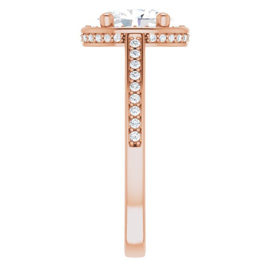 * Your ring’s total carat weight (TCW), band width, weight in grams, and/or number and size of accent, pavé, or halo stones will vary up or down depending on your choice of customizable center stone shape and size, precious metal type, and finger ring size via the drop-down options provided.