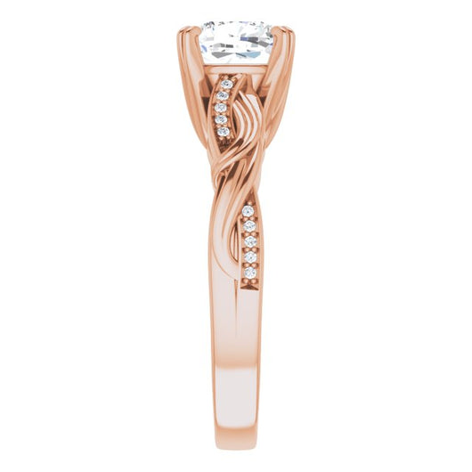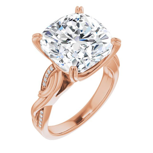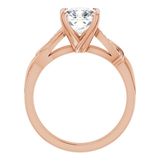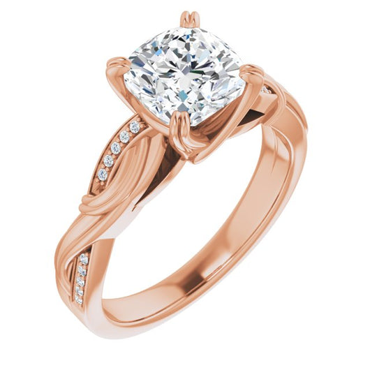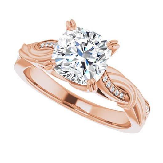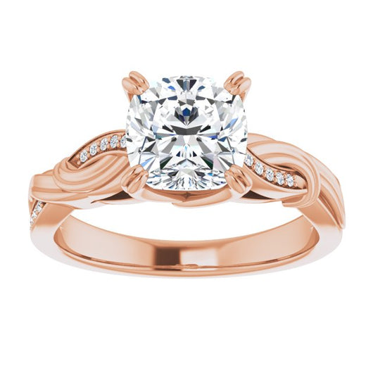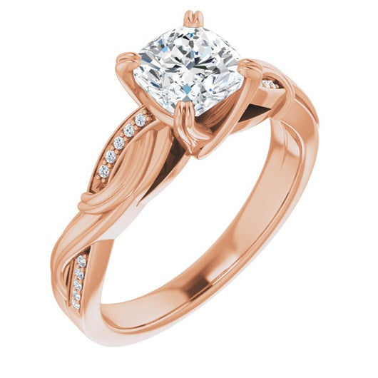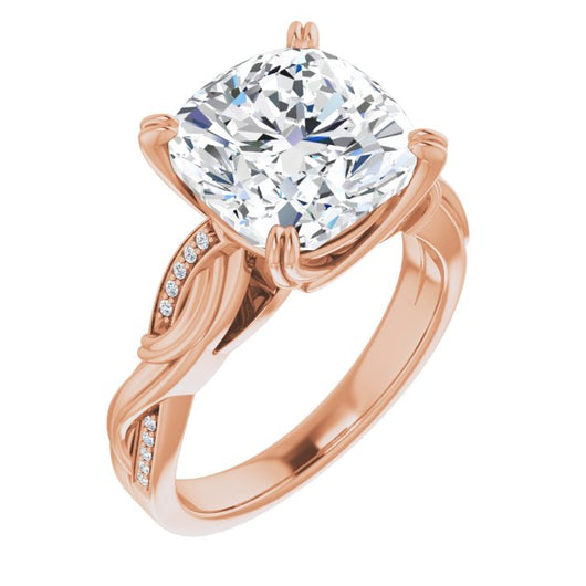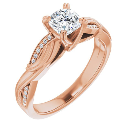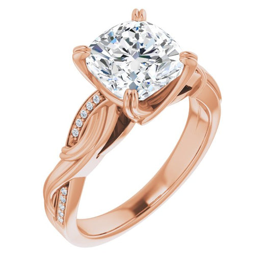 10K Rose Gold Customizable Cathedral-raised Cushion Cut Design featuring Rope-Braided Half-Pavé Band