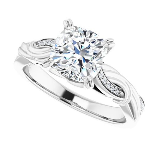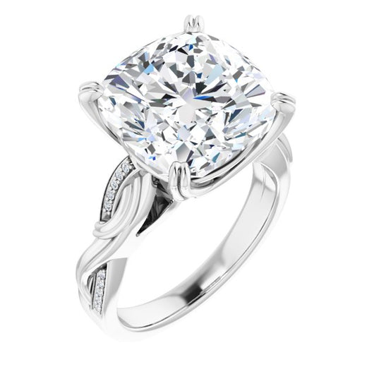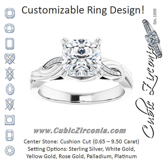The prong-set, Cushion cut center stone is held up high in a cathedral setting, featuring your choice of 0.65 to 9.50* carats of our 5A diamond-quality cubic zirconia. You can also click the "customize" link to see/purchase The Fabiola with other center stone shape configurations.