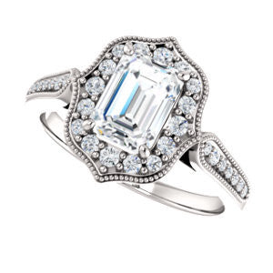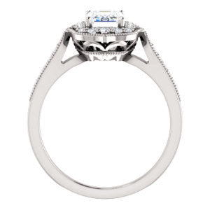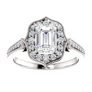 Prong-set. Center setting adorned with fourteen (14)* small surrounding halo accents from 1.20 to 1.30 mm* in dimension. Decorative trellis with engraving styled in a French flavoring. Sixteen (16)* round-pavé band accents add a flourish. Manufactured with an attractive, vintage milgrained-edge band that says forever won't be long enough to cherish you.