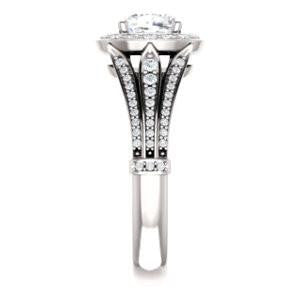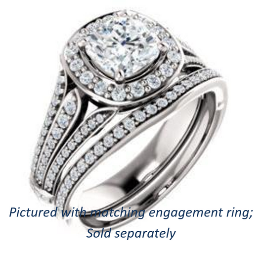 In case you were wondering, this ring is available in any of 12 precious metal types and features a 0.65, 1.00, 1.50, 2.50, 3.50, or 5.00 carat 5A diamond-quality Cushion Cut cubic zirconia center stone. The halo and tri-split pavé band together total eighty-four (84)* round-cut accent stones. Get The Frannie engagement ring as a stand-alone or together with the matching anniversary band to complete the cubic zirconia bridal set!