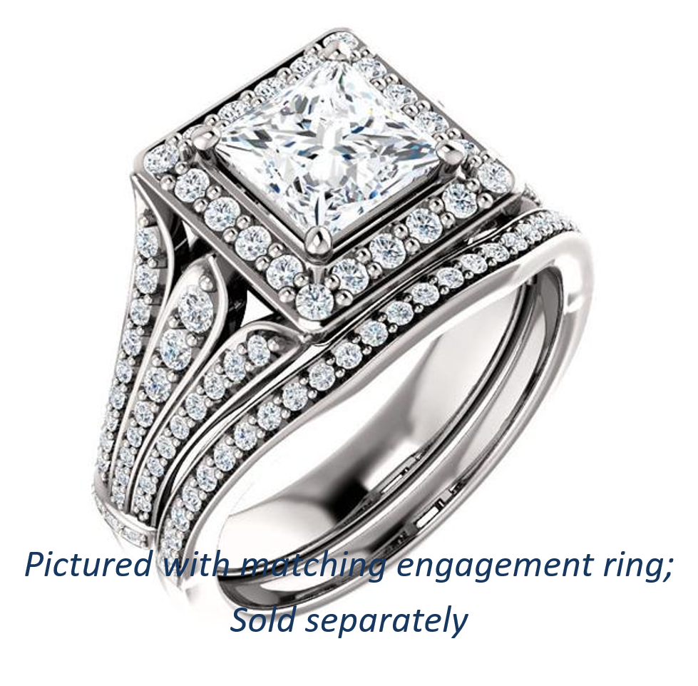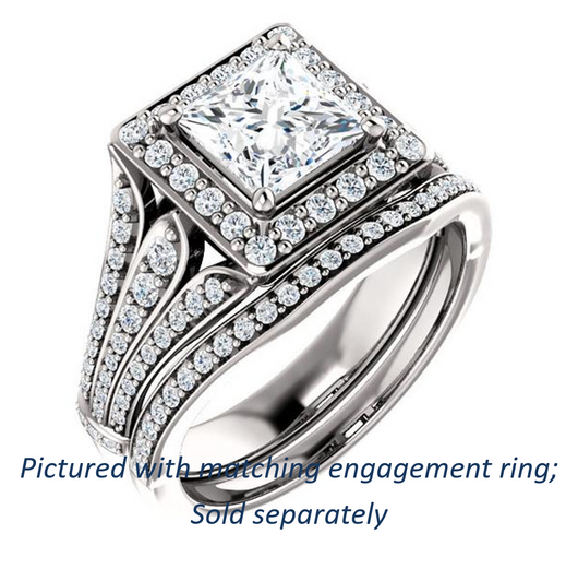 In case you were wondering, this ring is available in any of 12 precious metal types and features a 0.65, 1.00, 1.50, 2.50, 3.50, or 5.00 carat 5A diamond-quality Princess Cut cubic zirconia center stone. The halo and tri-split pavé band together total eighty-four (84)* round-cut accent stones. Get The Frannie engagement ring as a stand-alone or together with the matching anniversary band to complete the cubic zirconia bridal set!