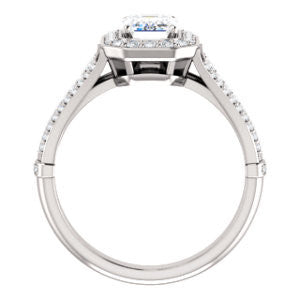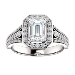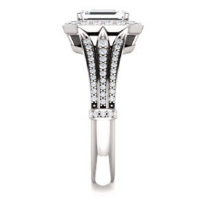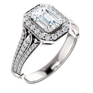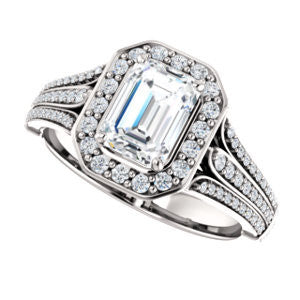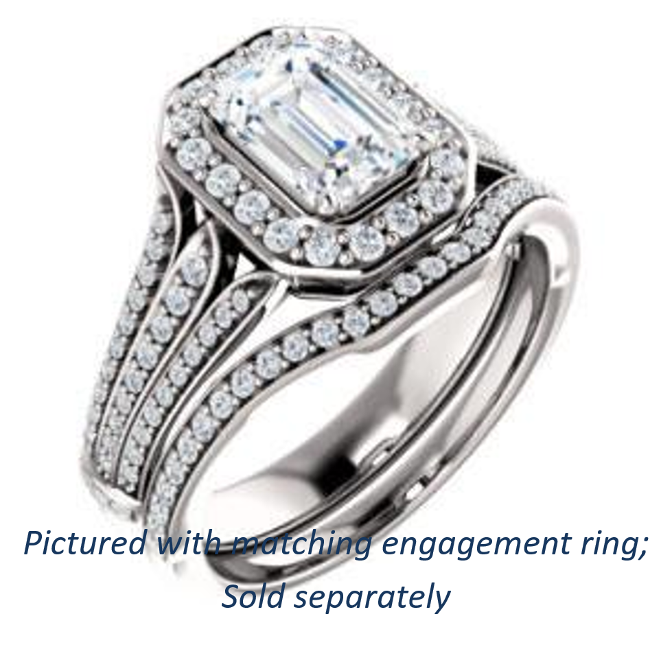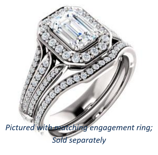 In case you were wondering, this ring is available in any of 12 precious metal types and features a 0.65, 1.00, 1.50, 2.50, 3.50, or 5.00 carat 5A diamond-quality Radiant Cut cubic zirconia center stone. The halo and tri-split pavé band together total eighty (80)* round-cut accent stones. Get The Frannie engagement ring as a stand-alone or together with the matching anniversary band to complete the cubic zirconia bridal set!