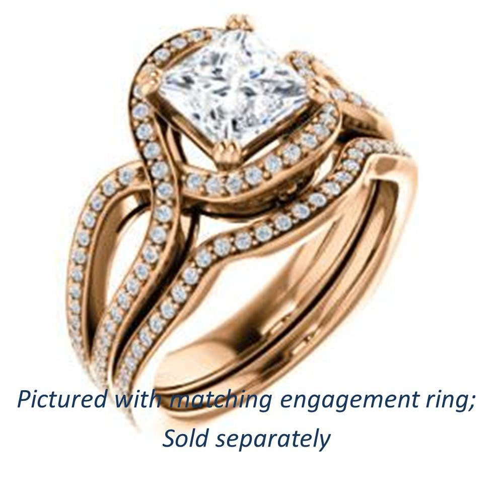 This outstanding engagement ring features an ultra-wide band with twisty fashion, and is a real staff favorite here at the one and only Cubic Zirconia.com. Take a long look at the Princess Cut 5A diamond-quality CZ gemstone sitting atop such a unique and intricate, pavé-studded, metal-work design and imagine it on a beautiful woman's ring finger…and don't be surprised if you love it, too. The Goldie engagement ring's precision design features eighty-six (86)*round-cut 0.80 mm accent stones that make up that twisty-pavé split-band and non-symmetrical halo style. With The Goldie, you'll slip a real beauty on your finger. Or hers. Or his finger for that matter, if that's how you get down! Love is love, as far as we’re concerned. Get The Goldie engagement ring as a stand-alone or together with the matching anniversary band to complete the cubic zirconia bridal set!