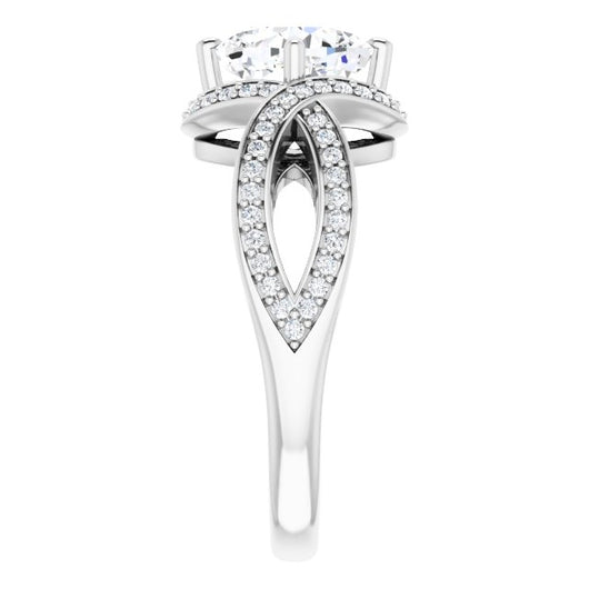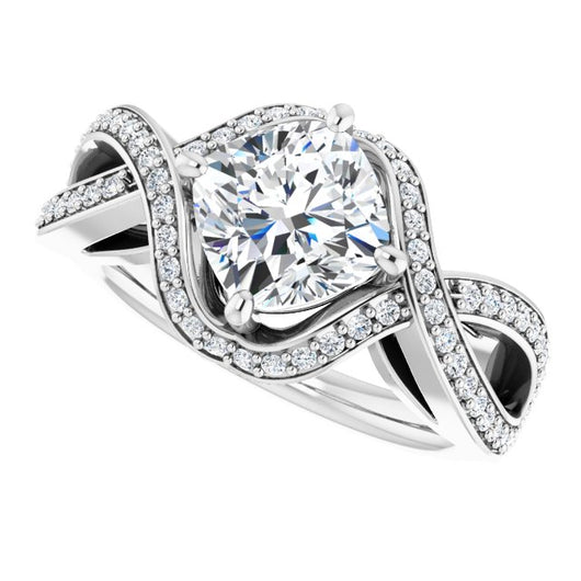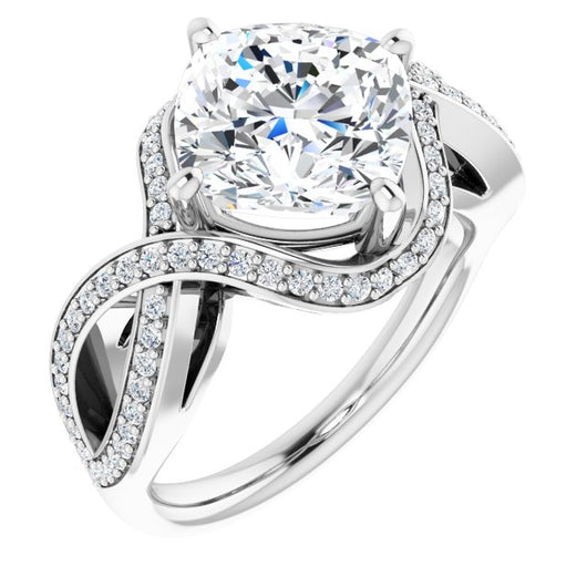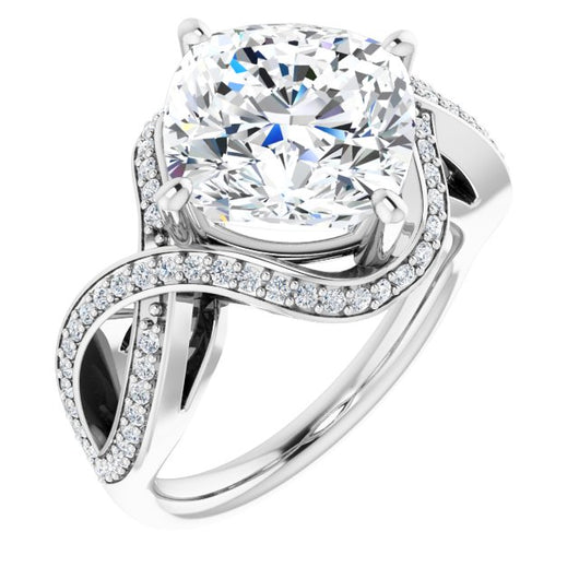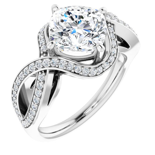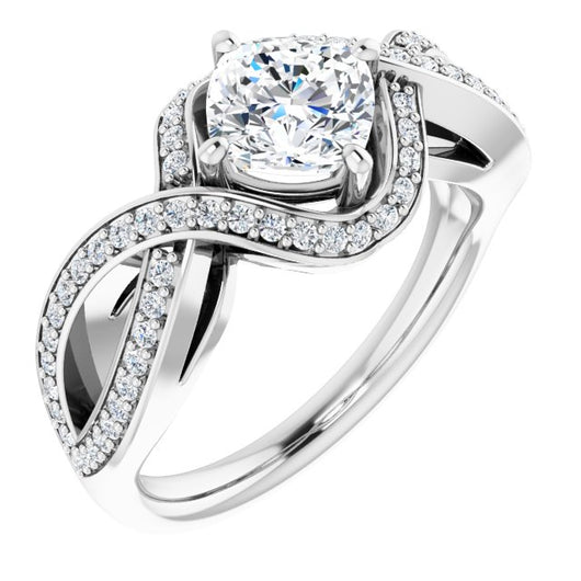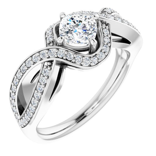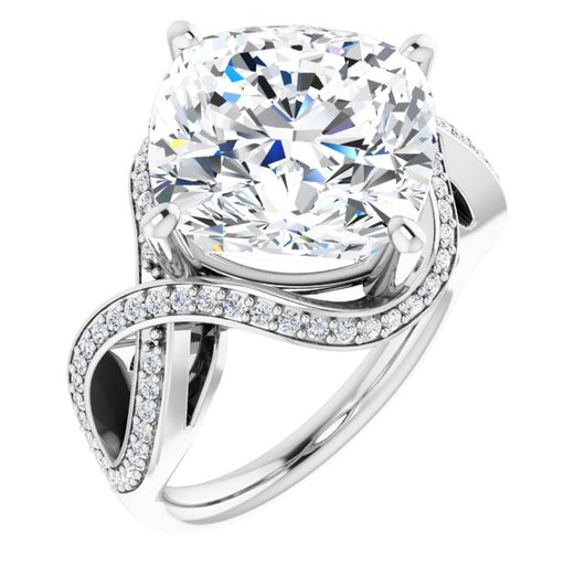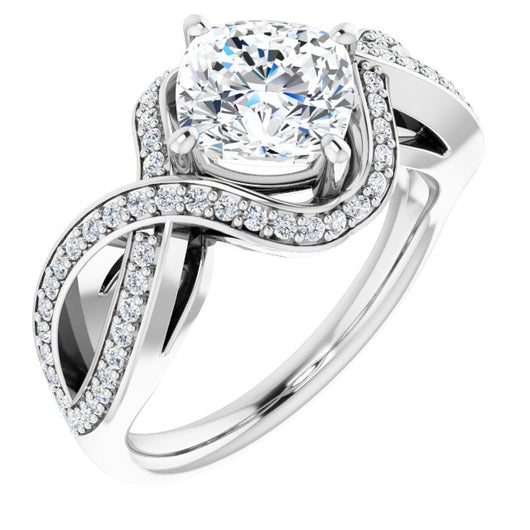 10K White Gold Customizable Cushion Cut Design with Twisting, Infinity-Shared Prong Split Band and Bypass Semi-Halo
