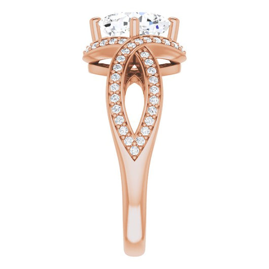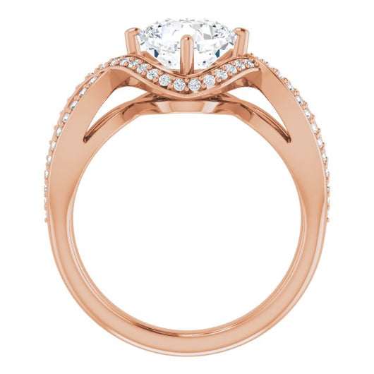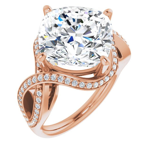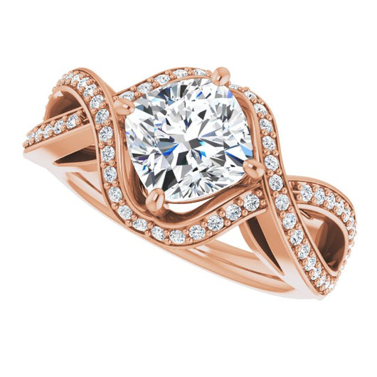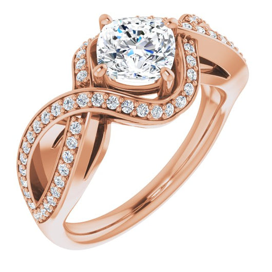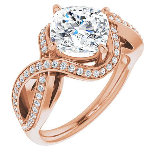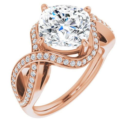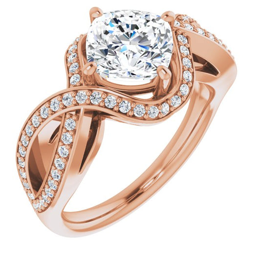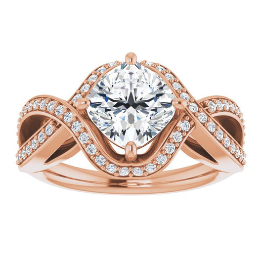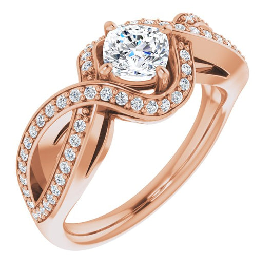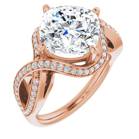 10K Rose Gold Customizable Cushion Cut Design with Twisting, Infinity-Shared Prong Split Band and Bypass Semi-Halo
