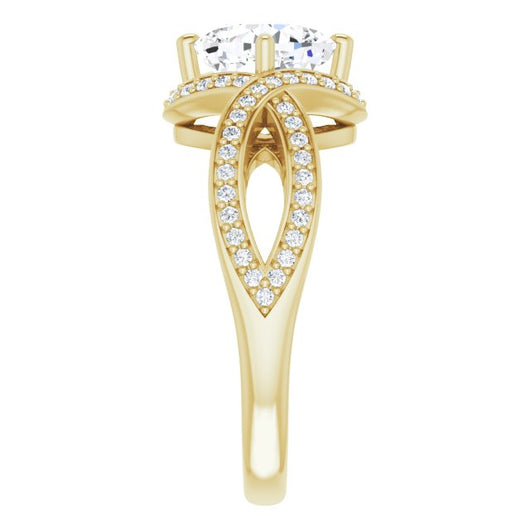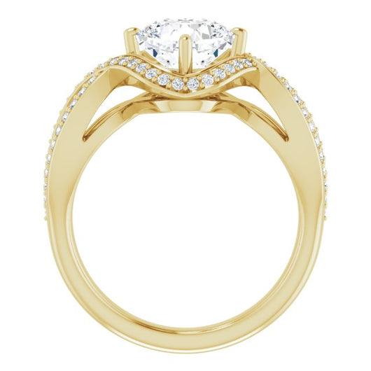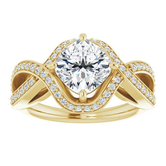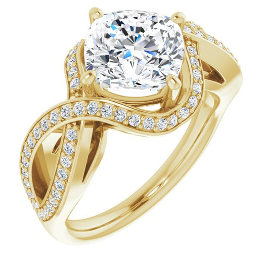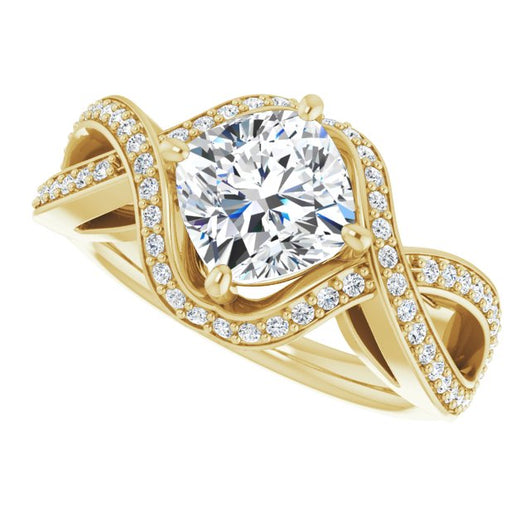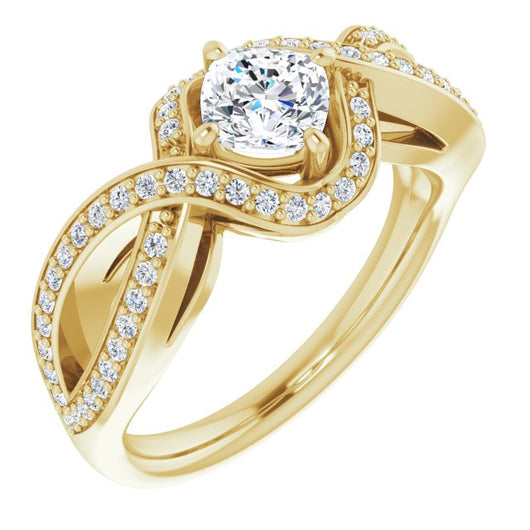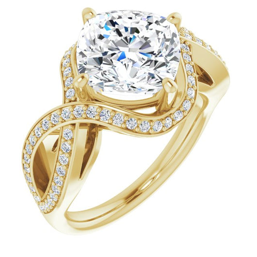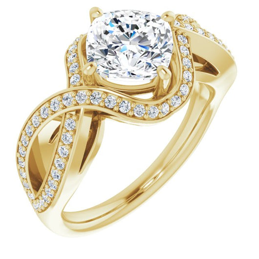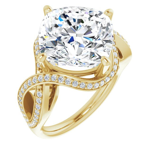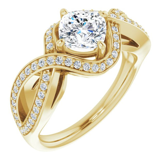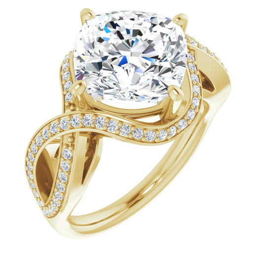 10K Yellow Gold Customizable Cushion Cut Design with Twisting, Infinity-Shared Prong Split Band and Bypass Semi-Halo