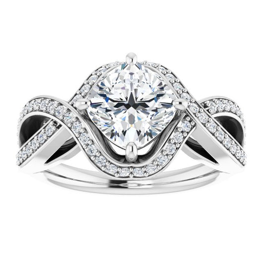 Whichever customizable option you choose, a wide and twisting split-shared prong band with infinity-symbol stylings wrap around the wearer's fortunate ring finger. Between the halo and band accents, there are a jackpot total of sixty-four (64)* small, round-cut accent stones. Winner, winner.