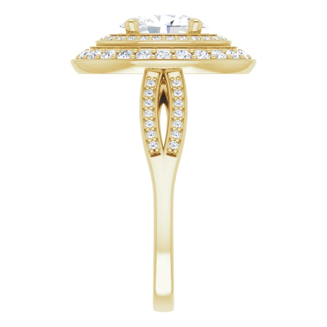 * Your ring’s total carat weight (TCW), band width, weight in grams, and/or number and size of accent, pavé, or halo stones will vary up or down depending on your choice of customizable center stone shape and size, precious metal type, and finger ring size via the drop-down options provided.