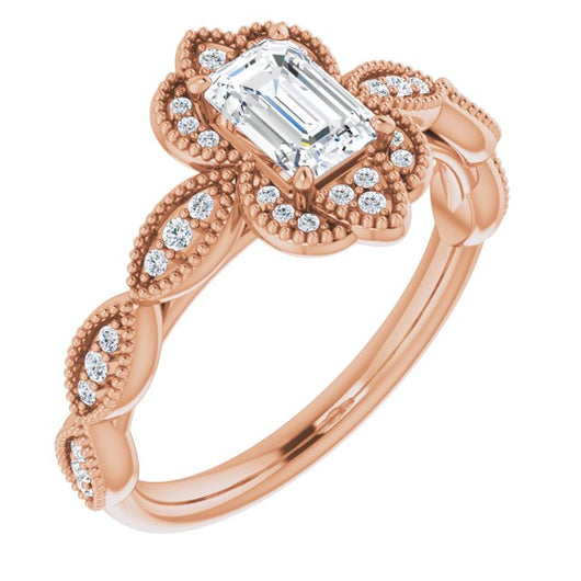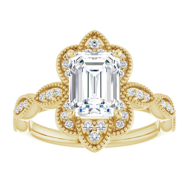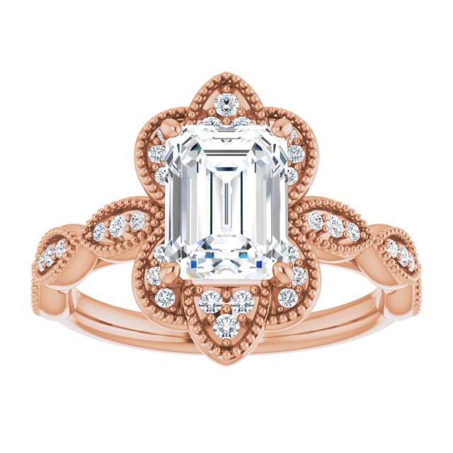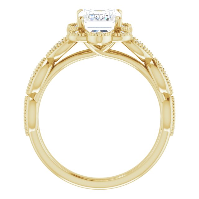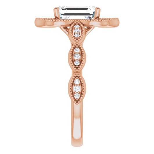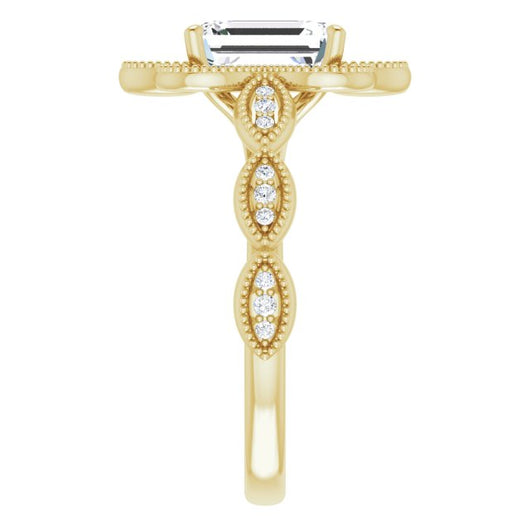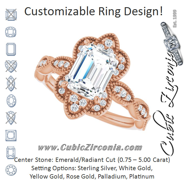 * Your ring’s total carat weight (TCW), band width, weight in grams, and/or number and size of accent, pavé, or halo stones will vary up or down depending on your choice of customizable center stone shape and size, precious metal type, and finger ring size via the drop-down options provided.
