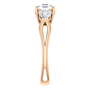 The Ila is a simple, beautiful 5A Asscher Cut cubic zirconia engagement ring without an ounce of pretension. How can something so modest be so magnificent? Her organic 3-stone design stands strong and pure, enhanced by a distinctively-shaped, canyon-inspired split band with an awe-inspiring charm like the greatest of natural wonders. Her trellis-decorated, cathedral-raised prong setting is substantial and secure in a world of artificial flash. She’s imbued with a powerful sense of positive karma (figuratively) and created to keep you grounded. Remind you of someone? Maybe the love of your life— a solid, earthy, and straightforward woman who has simple tastes in fashion. Practical and down-to-earth, possessing of both gentleness and gumption. That’s not all, though. You know the secret that her simple beauty runs much deeper, like treasure mined with respect from the bosom of Mother Earth herself.