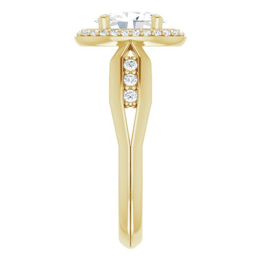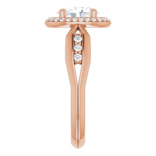 * Your ring’s total carat weight (TCW), band width, weight in grams, and/or number and size of accent, pavé, or halo stones will vary up or down depending on your choice of customizable center stone shape and size, precious metal type, and finger ring size via the drop-down options provided.