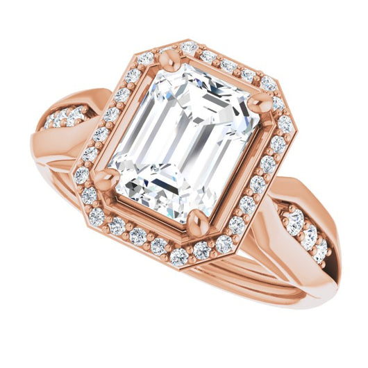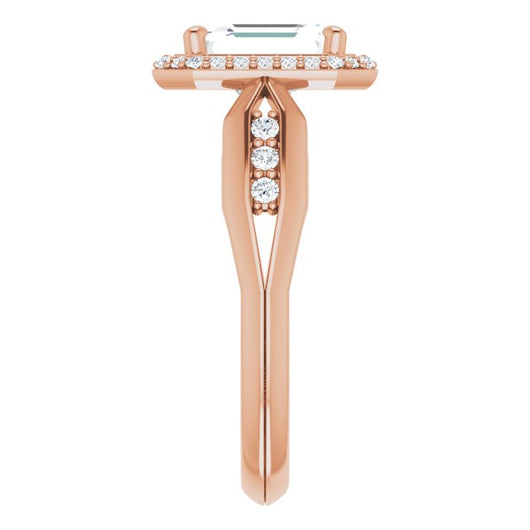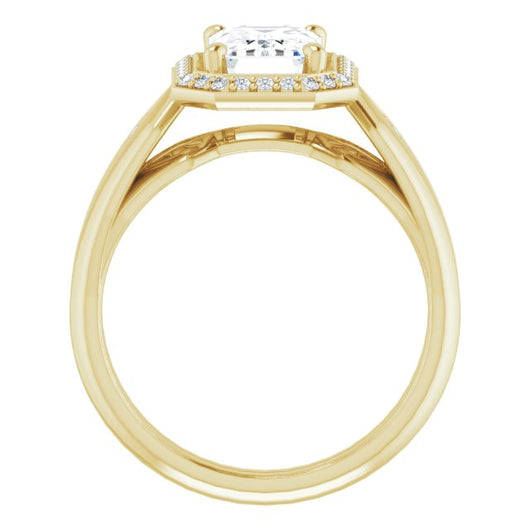 * Your ring’s total carat weight (TCW), band width, weight in grams, and/or number and size of accent, pavé, or halo stones will vary up or down depending on your choice of customizable center stone shape and size, precious metal type, and finger ring size via the drop-down options provided.