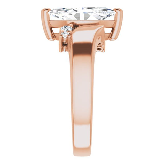 * Your ring’s total carat weight (TCW), band width, weight in grams, and/or number and size of accent, pavé, or halo stones will vary up or down depending on your choice of customizable center stone shape and size, precious metal type, and finger ring size via the drop-down options provided.
