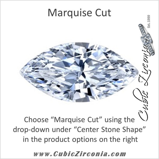 The Marquise Cut – of all the top center stone shapes, the marquise cut stone is among the least-requested in our CubicZirconia.com catalog, and perhaps the most uncommonly-seen among the gem cuts profiled in this article. Instead of serving as the primary or center stone in a ring or other piece of jewelry, marquise cut stones are more popularly used as accent stones. Although we do feel that a marquise-cut-centered ring design looks exceptional when placed vertically as a perpendicular gem enhancement above the backdrop of a horizontal, wide-banded ring design beneath! Due to its fragile corners and unwieldy shape, many jewelers find this brilliant-cut stone more difficult to work with than many other shapes. But the unique shape does have its admirers, and even though it's among the least popular of the profiled center stone shapes we're happy to provide hundreds of customizable ring styles that can be set with this beautiful gem shape. Care should also be taken when wearing jewelry with marquise cut stones because the shape has pointed tips that are prone to chipping and breakage. The marquise cut cut is elongated, with non-equal length and width.