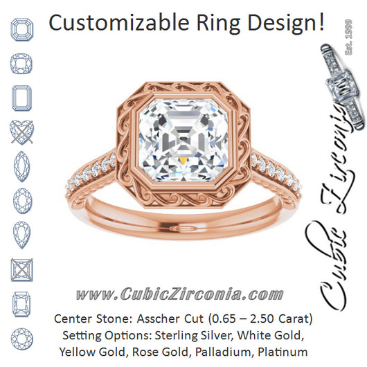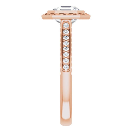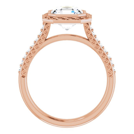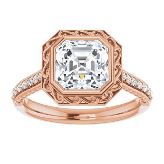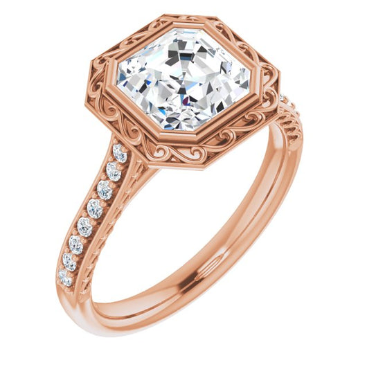 10K Rose Gold Customizable Cathedral-Bezel Asscher Cut Design featuring Accented Band with Filigree Inlay