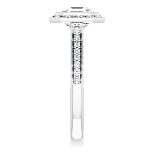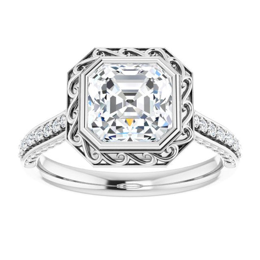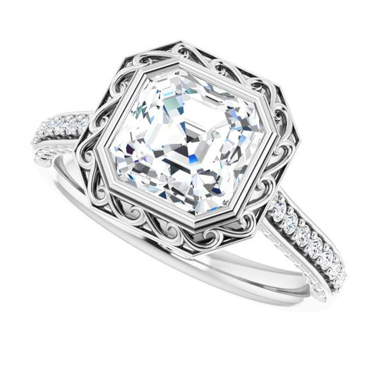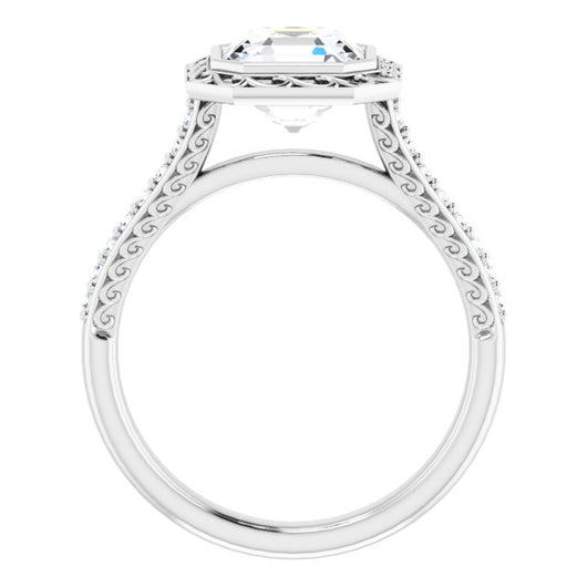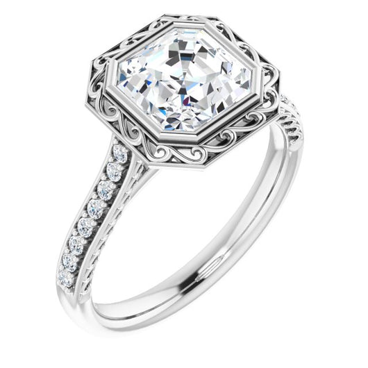 10K White Gold Customizable Cathedral-Bezel Asscher Cut Design featuring Accented Band with Filigree Inlay