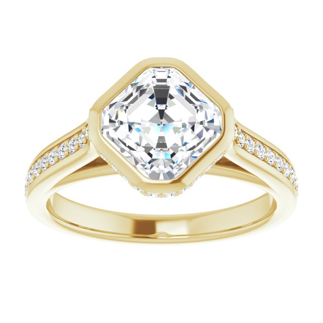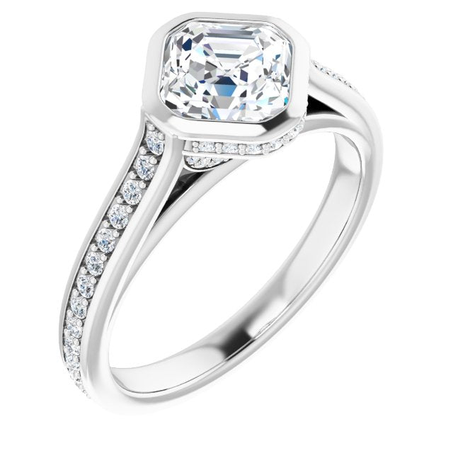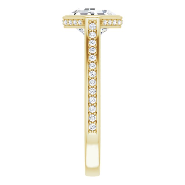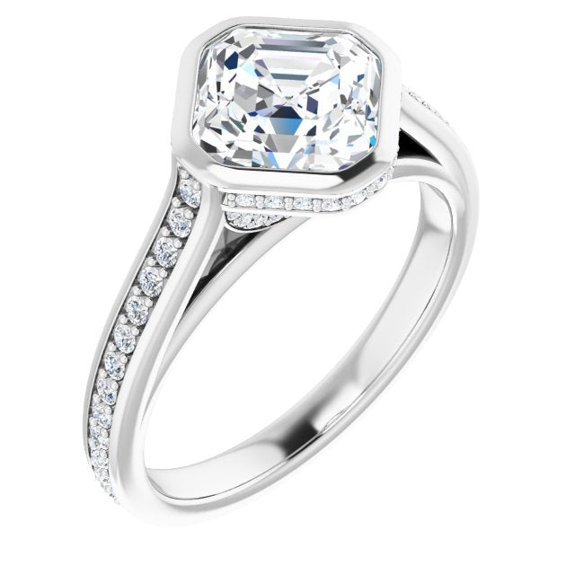 Warning: may be threatening to weak men. That's not simply an "under halo" of round accent stones running horizontally underneath the raised cathedral-style center setting of this artisan engagement ring. It's a moat. And you can count on that moat to protect The Jada's bezel-set 5A diamond-quality Asscher Cut CZ center stone like the treasure she is. And while you might think it's trendy to call it a shared prong band, the twenty-four (24)* 1.20 mm* round-cut accent stones encircling the wearer's finger in an electrifying glitter of awesomeness has a different purpose too... it's an intimidating perimeter fence designed to keep wife-rustling attempts by curious cowboys to a minimum. She ain't single no more, pardner. Big smile for that, which is the reason we designed a smile-inspired, accent-stone-studded decorative trellis right into the side of the center setting of this ring design (see the side view).