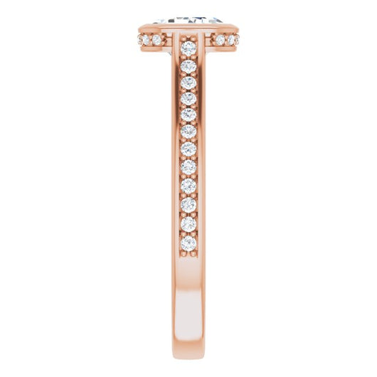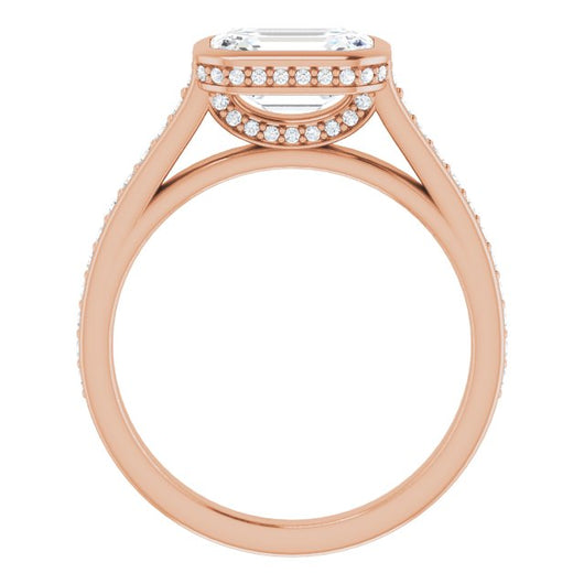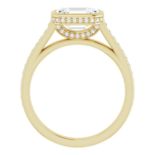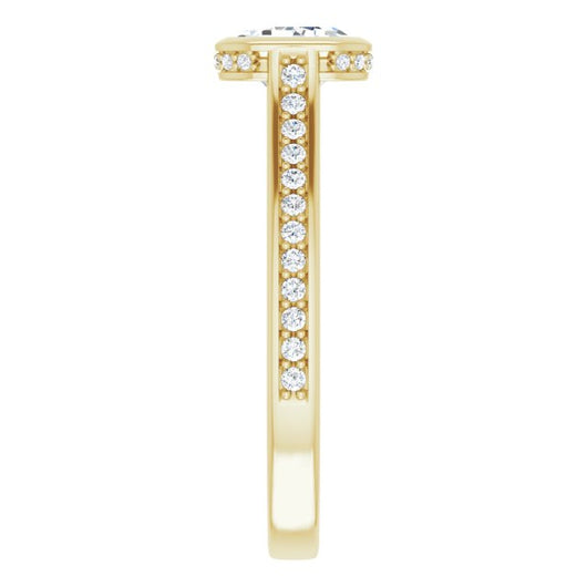 * Your ring’s total carat weight (TCW), band width, weight in grams, and/or number and size of accent, pavé, or halo stones will vary up or down depending on your choice of customizable center stone shape and size, precious metal type, and finger ring size via the drop-down options provided.