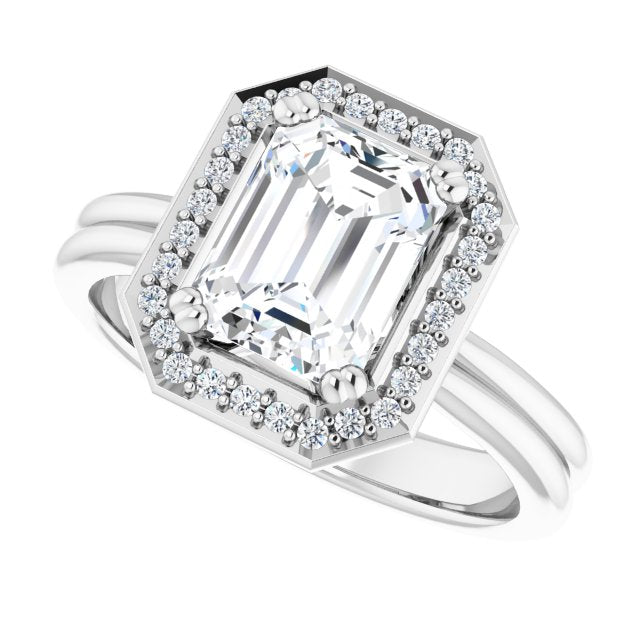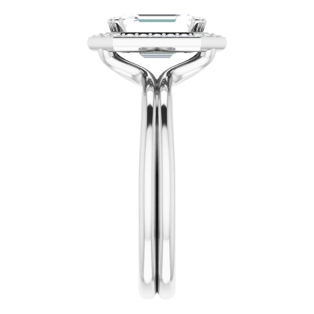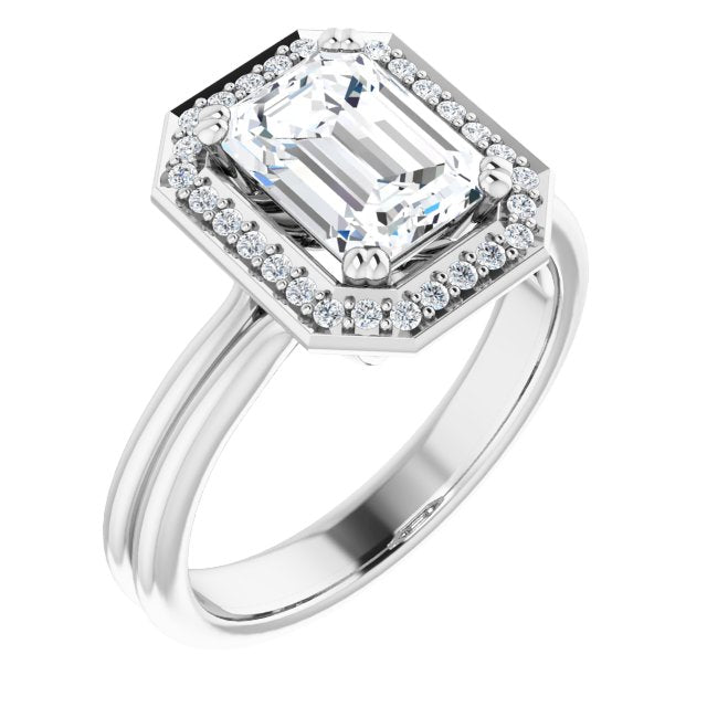 10K White Gold Customizable Emerald/Radiant Cut Style with Scooped Halo and Grooved Band