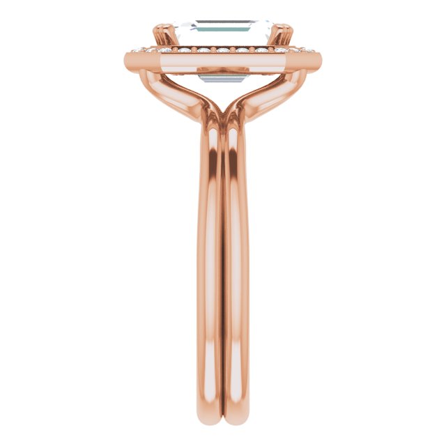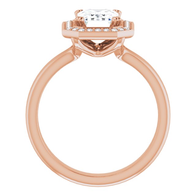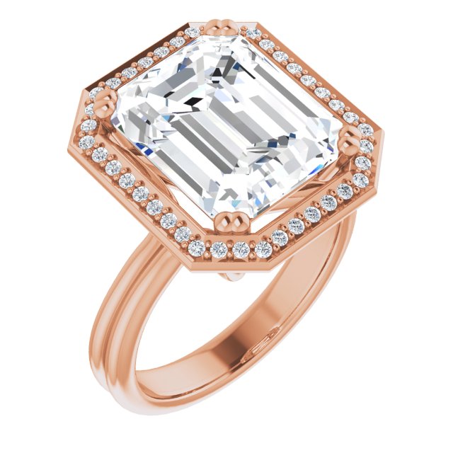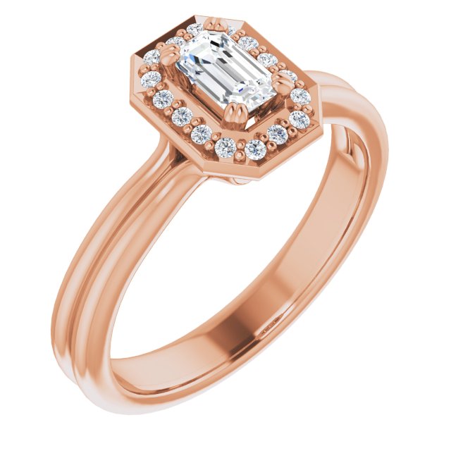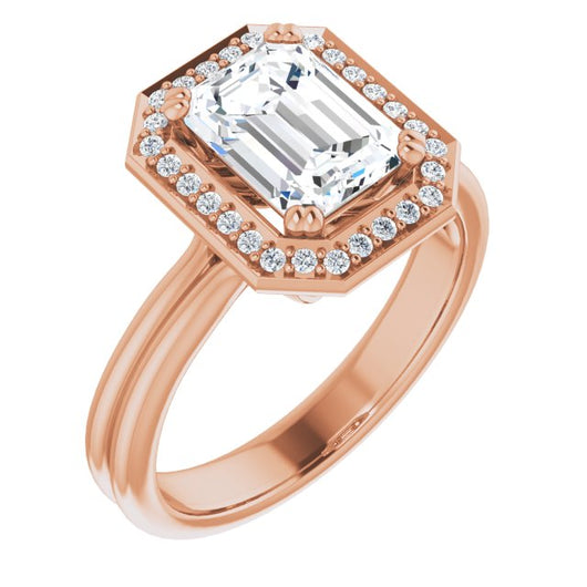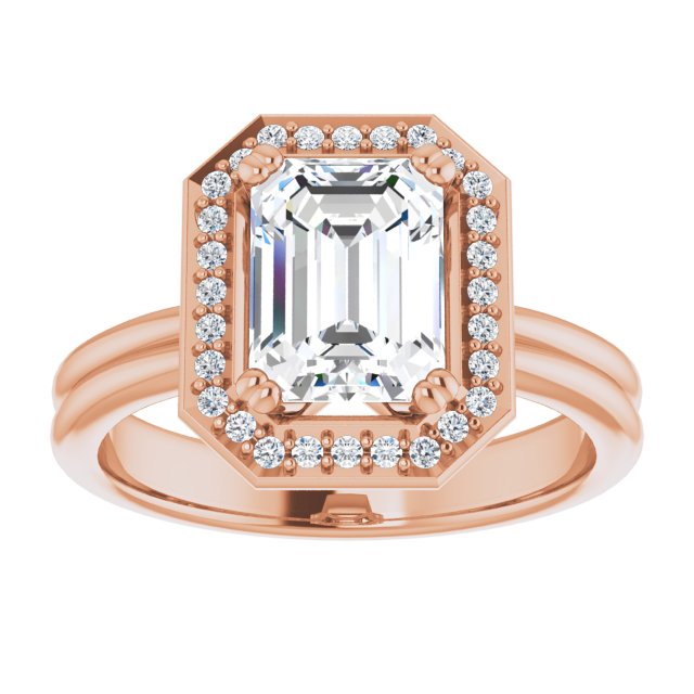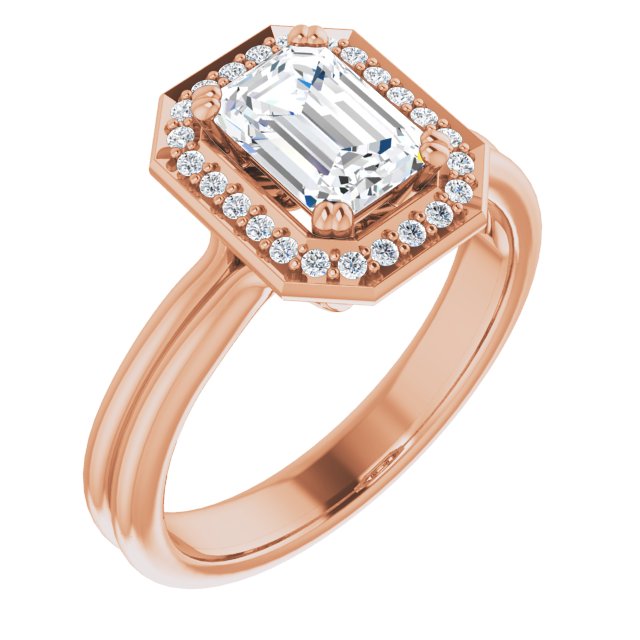 10K Rose Gold Customizable Emerald/Radiant Cut Style with Scooped Halo and Grooved Band