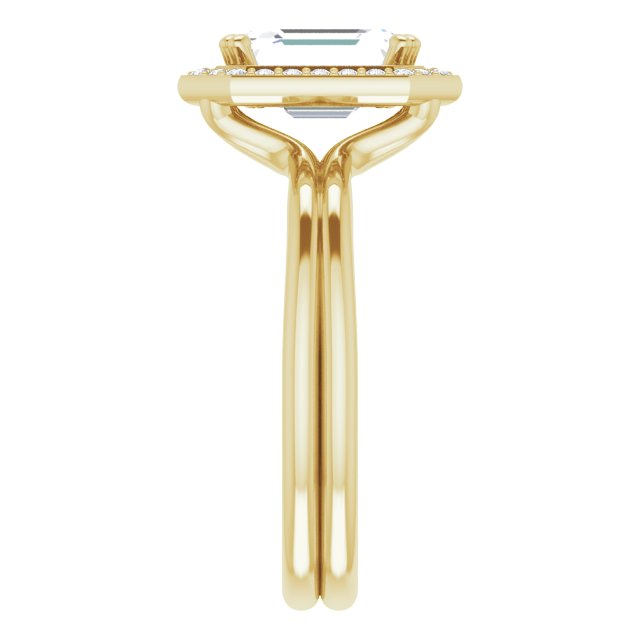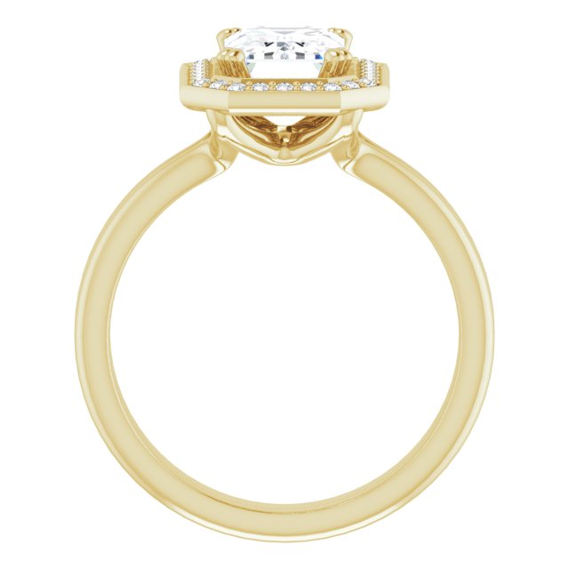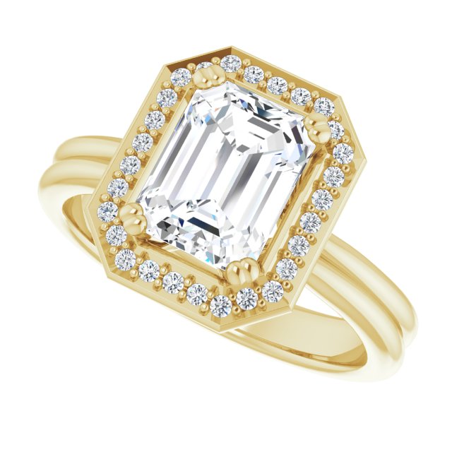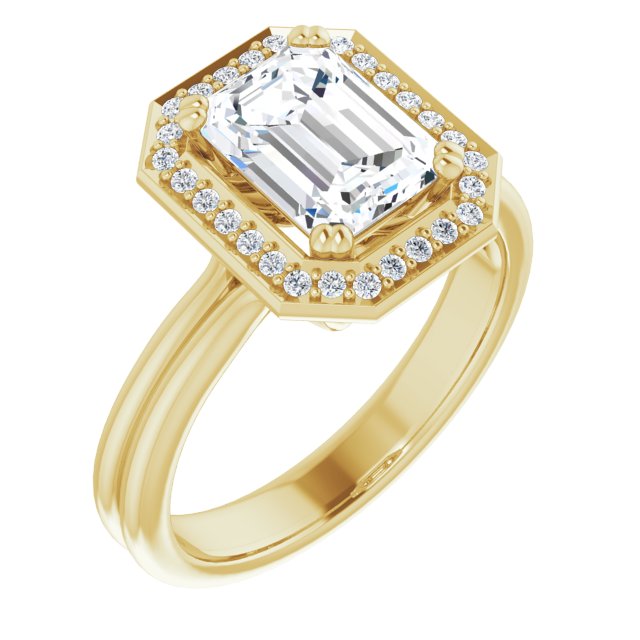 10K Yellow Gold Customizable Emerald/Radiant Cut Style with Scooped Halo and Grooved Band