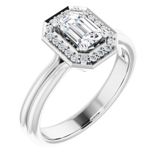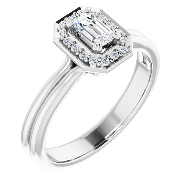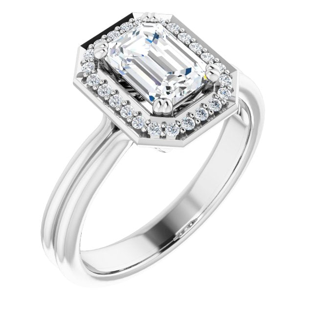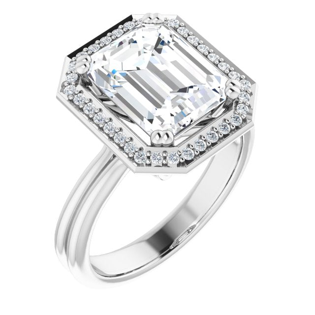 Cubic Zirconia Engagement Ring- The Jeanine Marie (Customizable Emerald Cut Style with Scooped Halo and Grooved Band)
