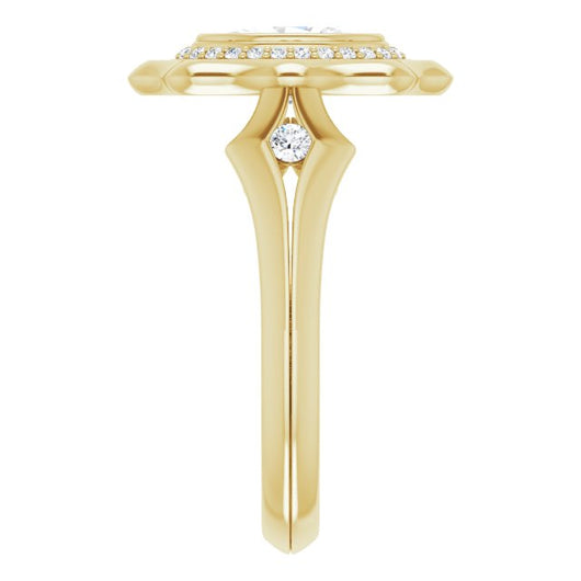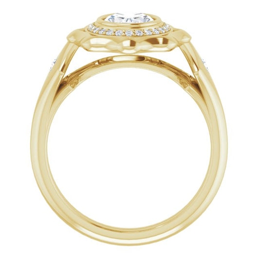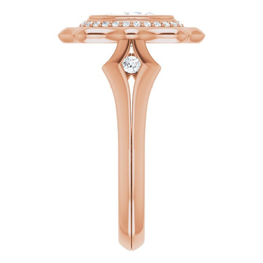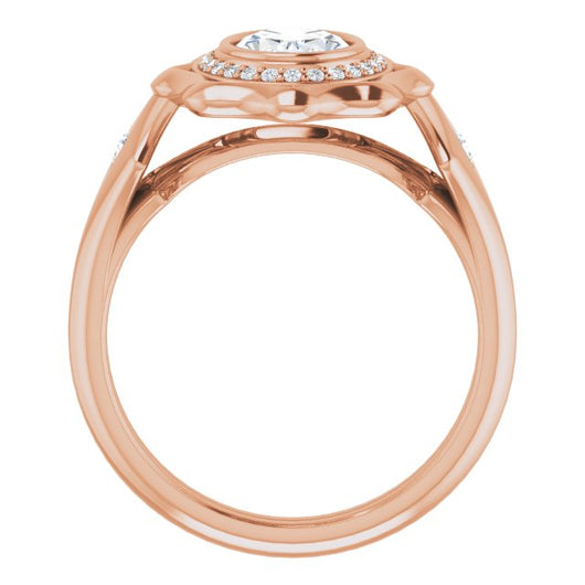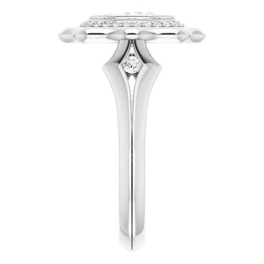 * Your ring’s total carat weight (TCW), band width, weight in grams, and/or number and size of accent, pavé, or halo stones will vary up or down depending on your choice of customizable center stone shape and size, precious metal type, and finger ring size via the drop-down options provided.