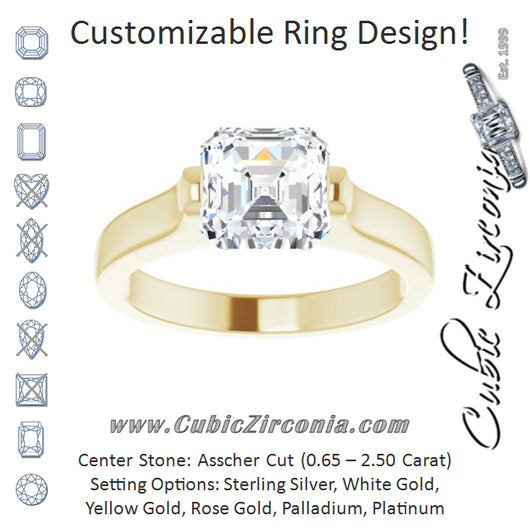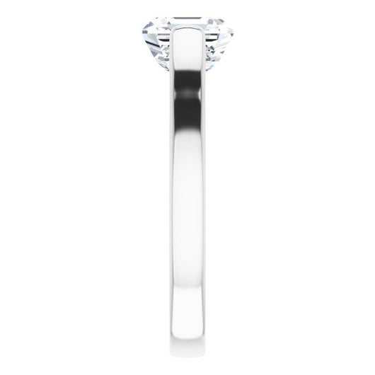 A 2.55 mm tapered to 2.75 mm* band crafted with precision in any of 12 precious metals you choose curves with strength from bottom up top to the geometrically-pleasing center setting. That ring topper is a rare bar-setting for the Asscher Cut center stone, which holds the solitaire from two sides rather than the more traditional 4 or 6 prong setting, or the more severe bezel setting with metal completely surrounding the center stone. Choose a center stone of 0.65 to 2.50* carats of Asscher cut 5A cubic zirconia from this product webpage, or click the "customize" link to change the solitaire's shape to any of five (5) other center stone shape options.
