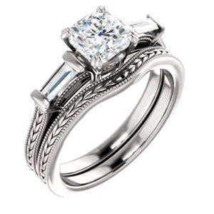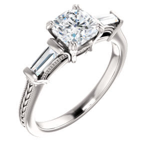 Cubic Zirconia Engagement Ring- The Kimiko (Customizable 3-stone Cushion Cut Design with Baguette Accents and Thin Wheat-Filigree Band)