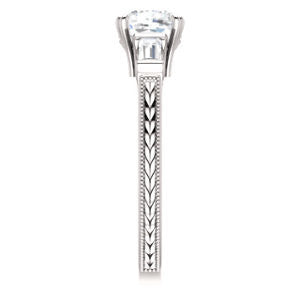 The Kimiko’s beautiful Cushion Cut 5A cubic zirconia center stone is flanked by dual bar-set, baguette accents, her terrific triplicate of diamond-quality sparkle held up by a cathedral-prong setting and underlined by an intricate, filigree design with wheat-inspired metalwork. Like the woman with whom you plan to spend all the rest of your years, The Kimiko engagement ring is a majestic work of art. In short, a woman with extraordinary value, and without price. Don’t hold back with this woman, dear sir, for she knows her own worth.