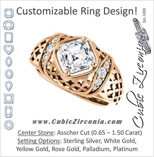 Cubic Zirconia Engagement Ring- The Leilani (Customizable Asscher Cut Vintage Crown Setting with Oversized Crosshatch Band)