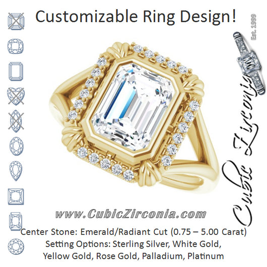 Cubic Zirconia Engagement Ring- The Leontine (Customizable Emerald Cut Design with Split Band and "Lion's Mane" Halo)