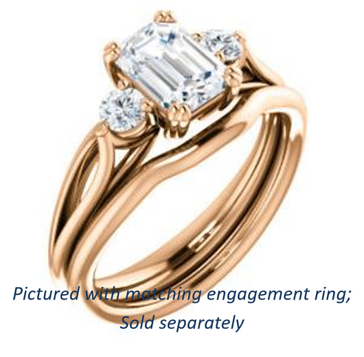 The Libby Leigh is crafted with a wide band that splits before coming back together beneath a high-raised cathedral-prong setting securing dual (2) 3.00 mm* round cut accent stones and a 5A diamond-quality Emerald Cut CZ center stone sized to your preference from 0.75 to 5.0 carats. With triple the traditional center stone, are you signifying that your love for her is well beyond an average relationship? Maybe. Is it? Get The Libby Leigh engagement ring as a stand-alone or together with the matching anniversary band to complete the cubic zirconia bridal set!