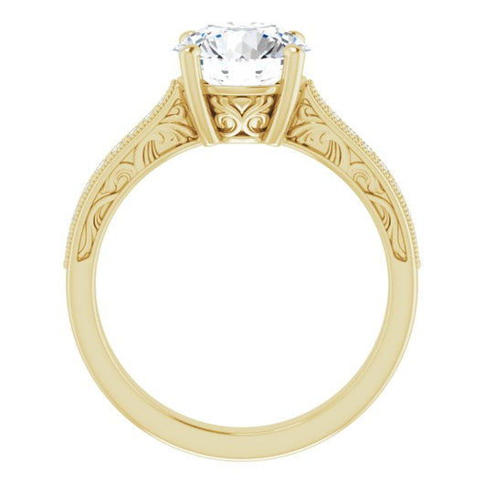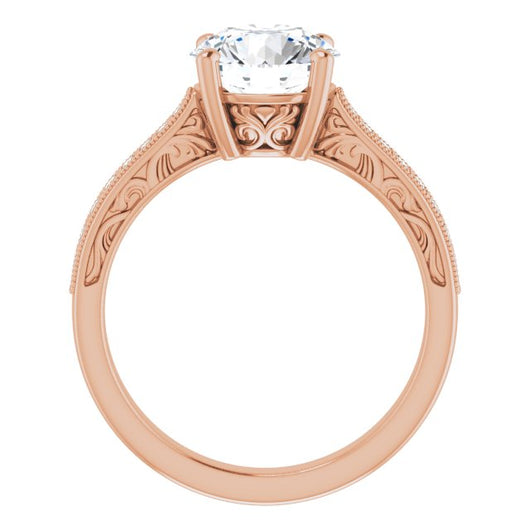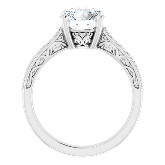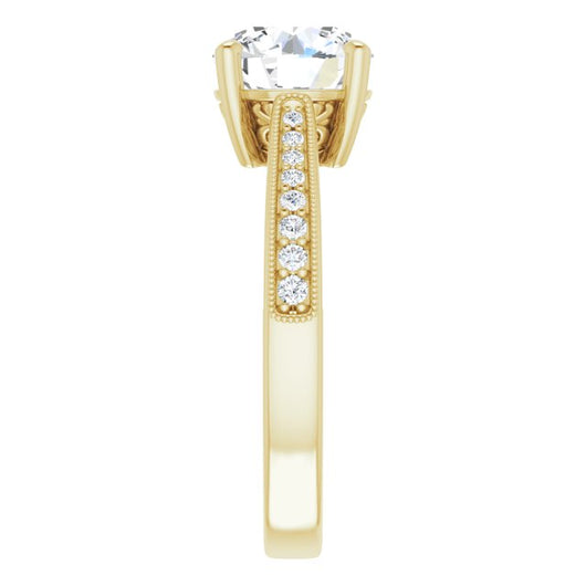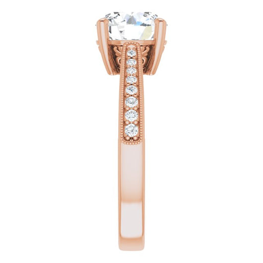* Your ring’s total carat weight (TCW), band width, weight in grams, and/or number and size of accent, pavé, or halo stones will vary up or down depending on your choice of customizable center stone shape and size, precious metal type, and finger ring size via the drop-down options provided.