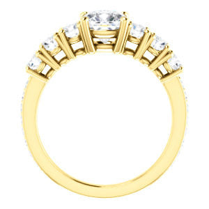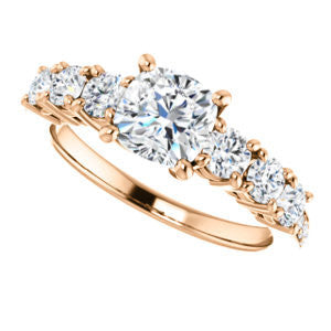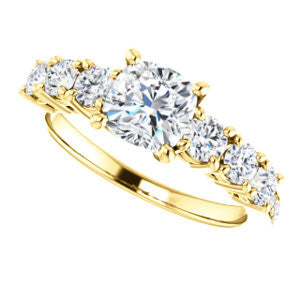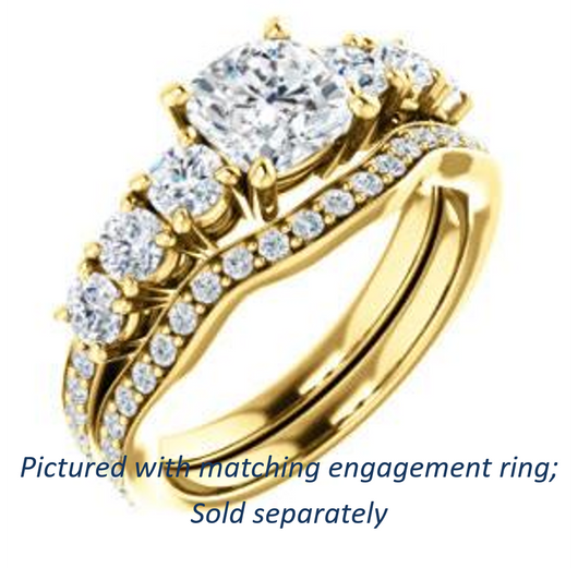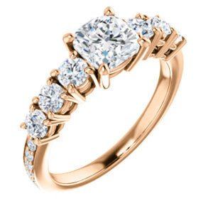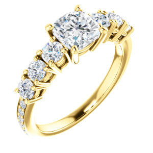 An exquisite engagement ring isn't a prerequisite to hearing "yes" when popping the question to ask the woman you love to spend the rest of your lives together...but it sure can't hurt, can it? Take a good look at this unique enhanced 7-stone ring and tell us if 'exquisite' isn't an appropriate adjective to describe it!  An exquisite engagement ring for an enchanting woman is exactly what you'll get when you choose this item, featuring not just six larger round accent stones but also sixteen (16)* round pavé accent stones. Full of inherent allure and charm, this is a seriously resplendent piece of jewelry bound to entrance everyone who lays eyes on it. Further, as pictured and priced on this product webpage in Cushion Cut sized from 0.65 to 5.0 carats, you also have the unique ability to customize and choose any of 7 center stone shapes of your choice. King yourself. Get The Lorelei engagement ring as a stand-alone or together with the matching anniversary band to complete the cubic zirconia bridal set!