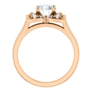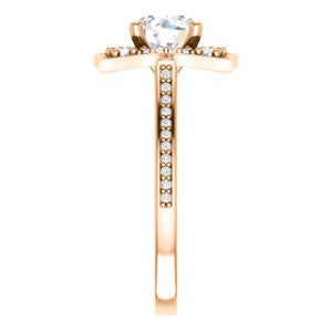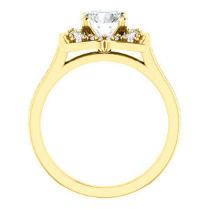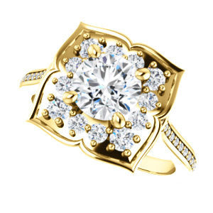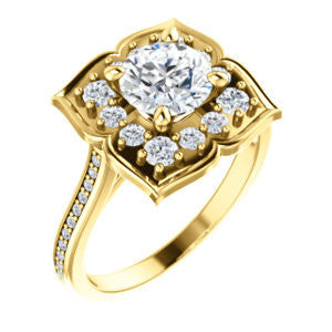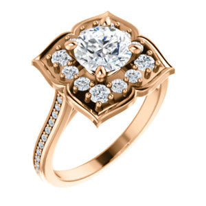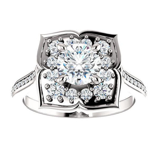 Women have been known to fall so in love with this customizable thin-pavé-band, cathedral-set engagement ring that they marry a man clearly beneath them. Choose 0.25 to 2.50 carats Round Cut center stone. If you're looking to "marry up", you simply can't go wrong asking Lucky Lucinda to put in a good word for you with the girl you desire. Lucky duck!  With a hint of 4-leaf clover-like design inspiring the round-accent-studded "flowerful" halo (Bucket List Item #356 "Make up a Word"...check!), you could use the extra good luck a clover-shaped ring might bring with your ugly mug. Seriously, what is your girl thinking? LOL, sorry we couldn't resist!