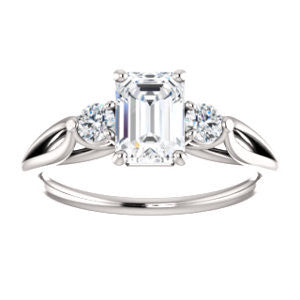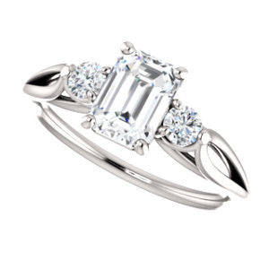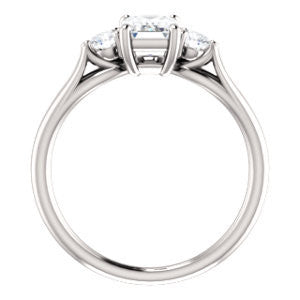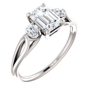 This is a jewelry piece guaranteed to make her smile or your money back. 5A (AAAAA) diamond-quality cubic zirconia + your choice of precious metals for manufacturing + your choice of Radiant Cut center stone sized from 0.75 to 5.0 carats (as pictured and priced on this product webpage, or choose one of 9 other center stone shapes using the link provided to “customize”) + two (2) traditional, round prong-style 3.00 mm* side stones + tapered split-band design with curvaceous allure + an attractive, high-raised cathedral setting that keeps the light (and the attention) right where it belongs = a 3-stone engagement ring you'll see worn with pride.