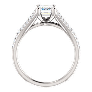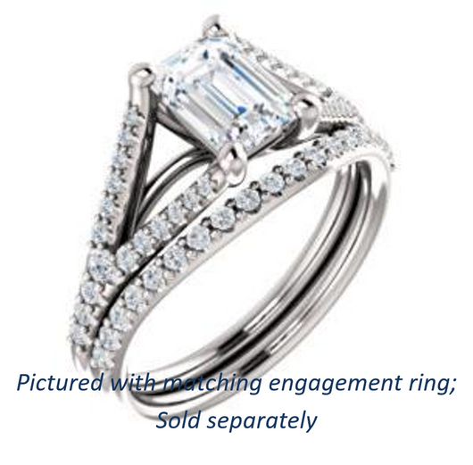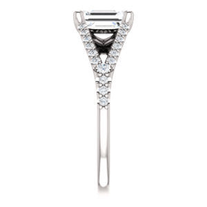 She is the light of your life, no doubt. That kind of special woman like yours deserves the unique ring you know she will adore. Choose your 5A diamond-quality cubic zirconia center stone from Radiant Cut (as pictured and priced on this product webpage from 0.75 to 5.0 Carats) or six other center stone options you can view using the “customize” link provided. No matter your chosen center stone shape, we'll snugly protect that sparkling diamond simulant in The Mailynne's high-cathedral-set, 4-prong cradle of fine, durable precious metal for a true “wow” effect that never gets old. The thirty-two (32)* round shared-prong accent stones marching in step down either side of the split-pavé band make this gorgeous ring stand out even more— just like she does. Don't hesitate, put this ring on her hand and kiss her like you stole her! Get The Mailynne engagement ring as a stand-alone or together with the matching anniversary band to complete the cubic zirconia bridal set!