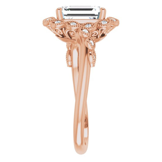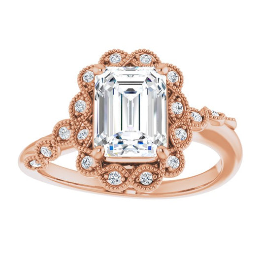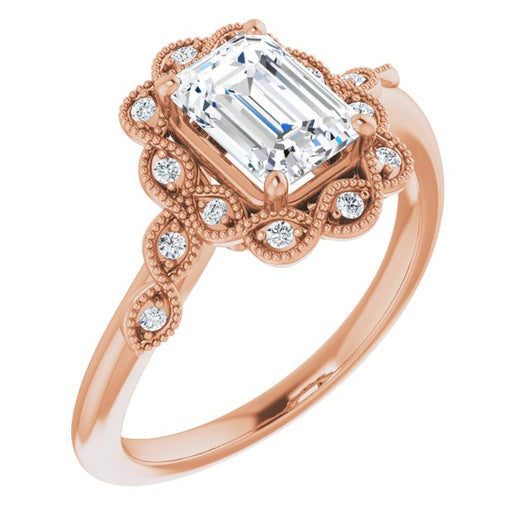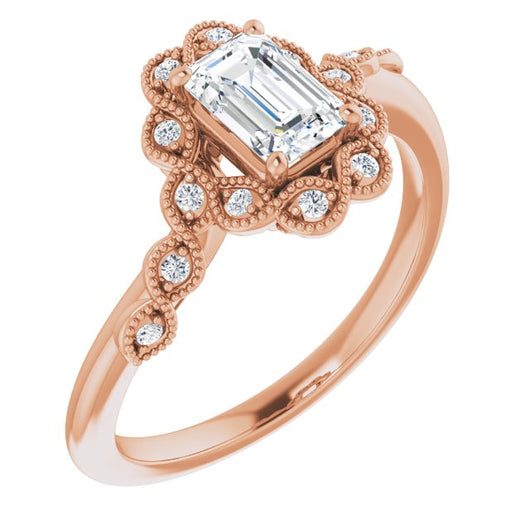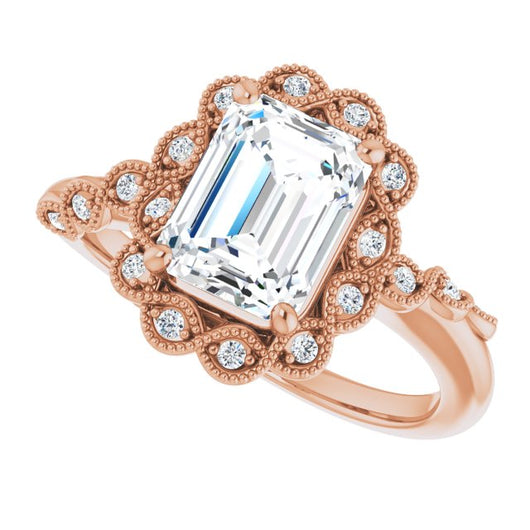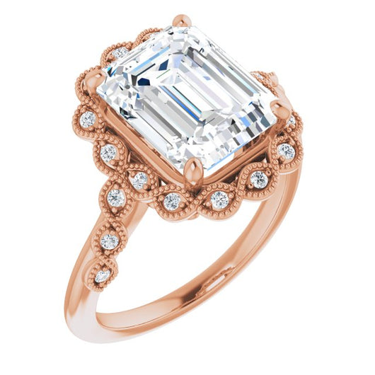 10K Rose Gold Customizable 3-stone Design with Emerald/Radiant Cut Center and Halo Enhancement