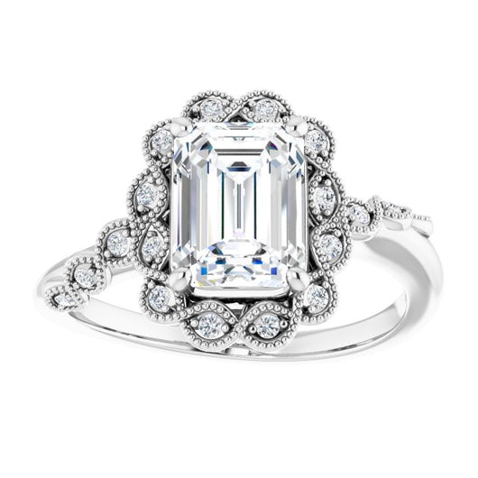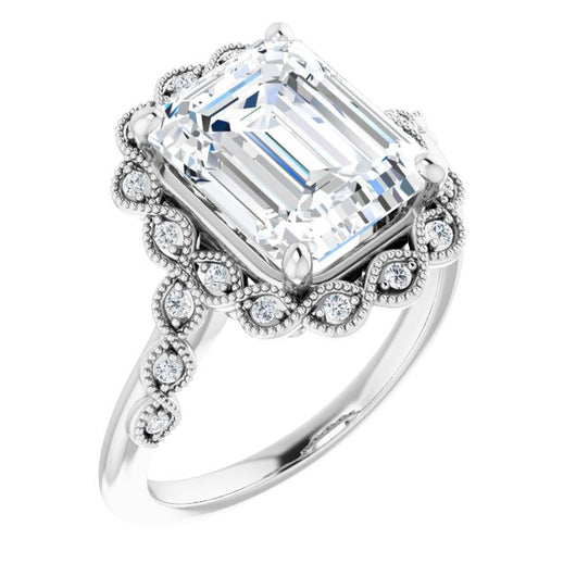 10K White Gold Customizable 3-stone Design with Emerald/Radiant Cut Center and Halo Enhancement