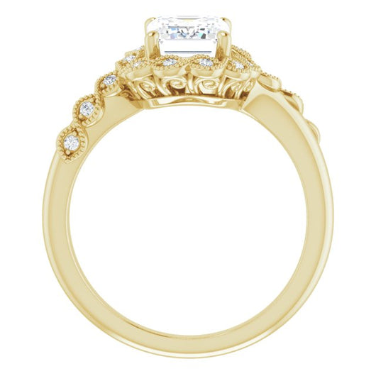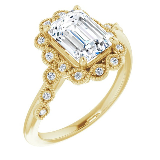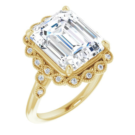 10K Yellow Gold Customizable 3-stone Design with Emerald/Radiant Cut Center and Halo Enhancement