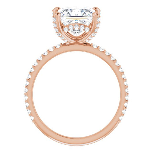 * Your ring’s total carat weight (TCW), band width, weight in grams, and/or number and size of accent, pavé, or halo stones will vary up or down depending on your choice of customizable center stone shape and size, precious metal type, and finger ring size via the drop-down options provided.