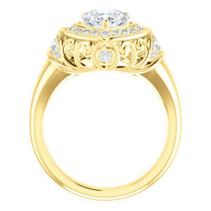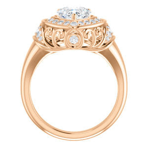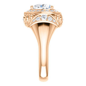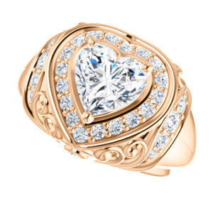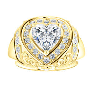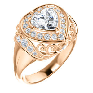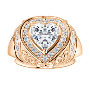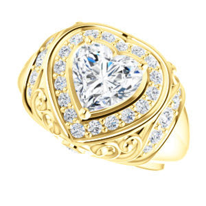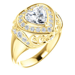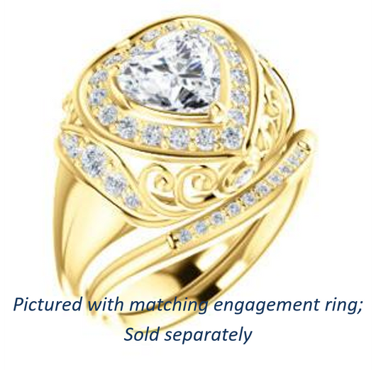 To the woman who will wear The Mariah: Every movement your hand makes will draw envy from females in a large crowd that can’t help but want to be you. We think you can handle that kind of intense attention. Are we right? This customizable-center ring (as pictured and priced with Heart Cut stone on this webpage) is a stepped-level halo style with dual bezel-set accents and a delicate lattice-like, crown-inspired, flowing metallic design sprinkled with round cut accet stones. The Mariah can be ordered in 12 precious of metals and with center stone from 0.50 to 4.0 carats-- all of which are sure to sparkle in any surroundings for decades. Complete this engagement ring's wedding set with the matching anniversary band (and receive a nice two-ring discount)!