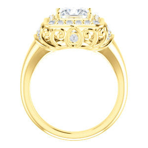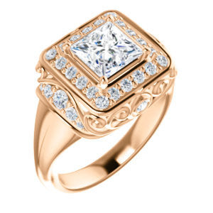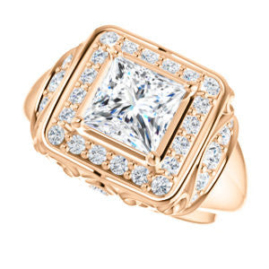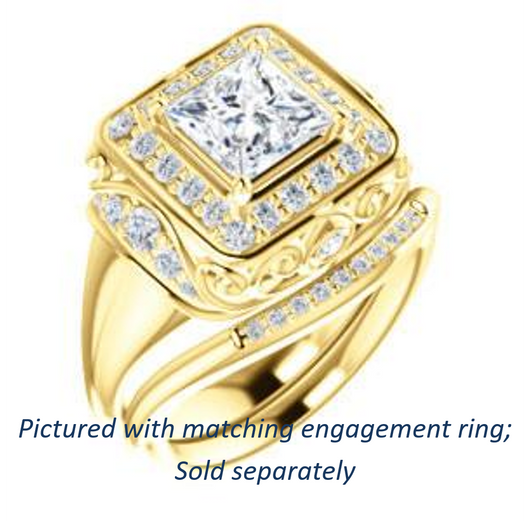 To the woman who will wear The Mariah: Every movement your hand makes will draw envy from females in a large crowd that can’t help but want to be you. We think you can handle that kind of intense attention. Are we right? This customizable-center ring (as pictured and priced with Princess Cut stone on this webpage) is a stepped-level halo style with dual bezel-set accents and a delicate lattice-like, crown-inspired, flowing metallic design sprinkled with round cut accet stones. The Mariah can be ordered in 12 precious of metals and with center stone from 0.40 to 5.0 carats-- all of which are sure to sparkle in any surroundings for decades. Complete this engagement ring's wedding set with the matching anniversary band (and receive a nice two-ring discount)!