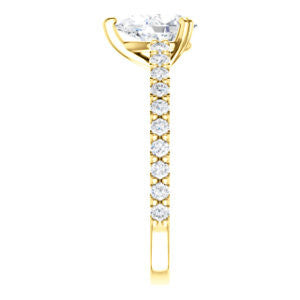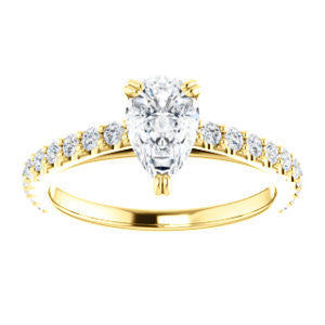 Simple. Comfortable. Reliable. Yet there's something extra about this classic ring style you likely won't feel until you see the wearer step away from the dirty dishes and the demanding kids, slip into something black and slinky and sit across from you enjoying grown-up conversation, roast duck, under-table footsie, and glass after glass of pinot grigio. This is a ring that imbues a sense of leisurely panache that translates into class in any language. The Marianne engagement ring is surely simple, but her small touches like raised cathedral-setting, thin profile and 20*-stone pavé band, create an exotic flair. Close your eyes and become a sexy, French character right out of a romance novel. Her simplicity of style featuring a 0.75 to 2.0 carat Pear cut center stone and an organic-curved, shared-prong-setting, diamond-quality accent stone cascade creates a classic look crafted in your choice of Palladium, 950 Platinum, White Gold, Yellow Gold, Rose Gold or .925 Sterling Silver.