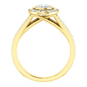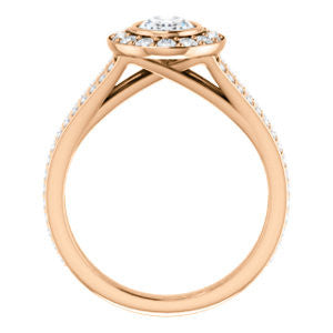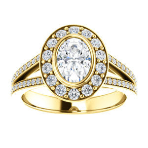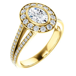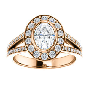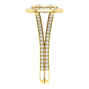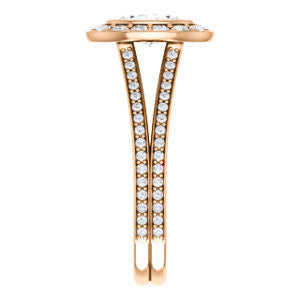 The Maricela engagement ring is a true original made for a true original: the one who caught your attention when you least expected it, she who stood out from all the others. You know her greatness deserves the best, and we think this Hispanic-named ring delivers the goods. A lovely piece of bridal jewelry, The Maricela features a chic bezel-set center stone and seventy-six (76)* round-cut accent stones from 1.00 to 1.70 mm* in dimension. The twelve (12)* larger accent stones form a brilliant halo of stones encircling the 0.25 to 5.0 carat Oval Cut center stone. The remainder of the smaller side stones make up a very pretty pavé band, split in two long, widely separated legs. Together the tapered band sections curve underneath in an attractive decorative prong trellis holding up a cathedral-setting style designed to set sparkle high on the woman's finger who wears it.