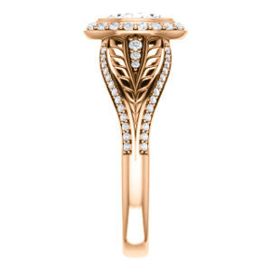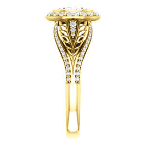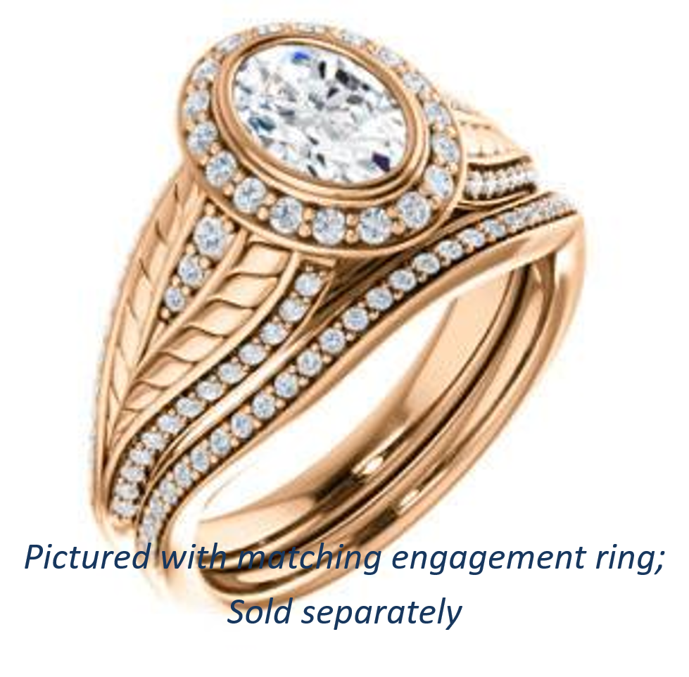 When you've found a woman who can just kick back and enjoy an evening listening to groovy Tom Petty tunes, then you want to get her an engagement ring like The Mary Jane. This three-sided, cathedral-raised artisan ring style is one made to evoke that free and playful spirit you love in her. The Mary Jane, as pictured and priced on this product webpage, features a 0.50 to 5.0 carat Oval Cut center stone in a bezel setting with a halo design. The faux split pavé band wraps around a leaf-like metal design with three more side stones in the remaining space between the split. Unique and a little bohemian, just like your lady, The Mary Jane will be sure to get a "yes" to your proposal. Just ask when she's in the right mood, ya dig? Get The Mary Jane engagement ring as a stand-alone or together with the matching anniversary band to complete the cubic zirconia bridal set!