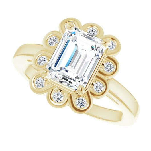 10K Yellow Gold Customizable 9-stone Emerald/Radiant Cut Design with Round Bezel Side Stones