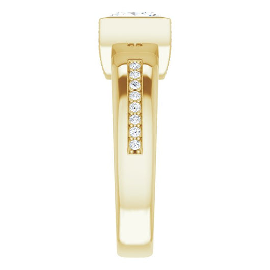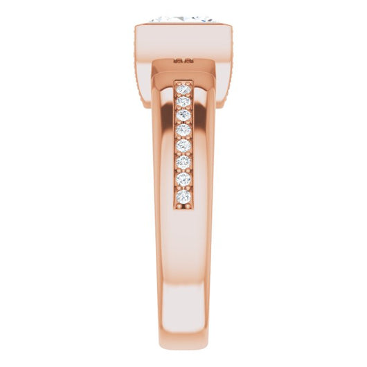 * Your ring’s total carat weight (TCW), band width, weight in grams, and/or number and size of accent, pavé, or halo stones will vary up or down depending on your choice of customizable center stone shape and size, precious metal type, and finger ring size via the drop-down options provided.